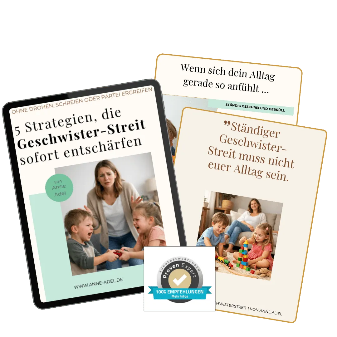 Dieses E-Book zeigt dir, wie du Geschwister-Streit entschärfst, ohne Drohungen, ohne selbst laut zu werden – und wieder mehr Ruhe und Harmonie in euren Alltag bringst.