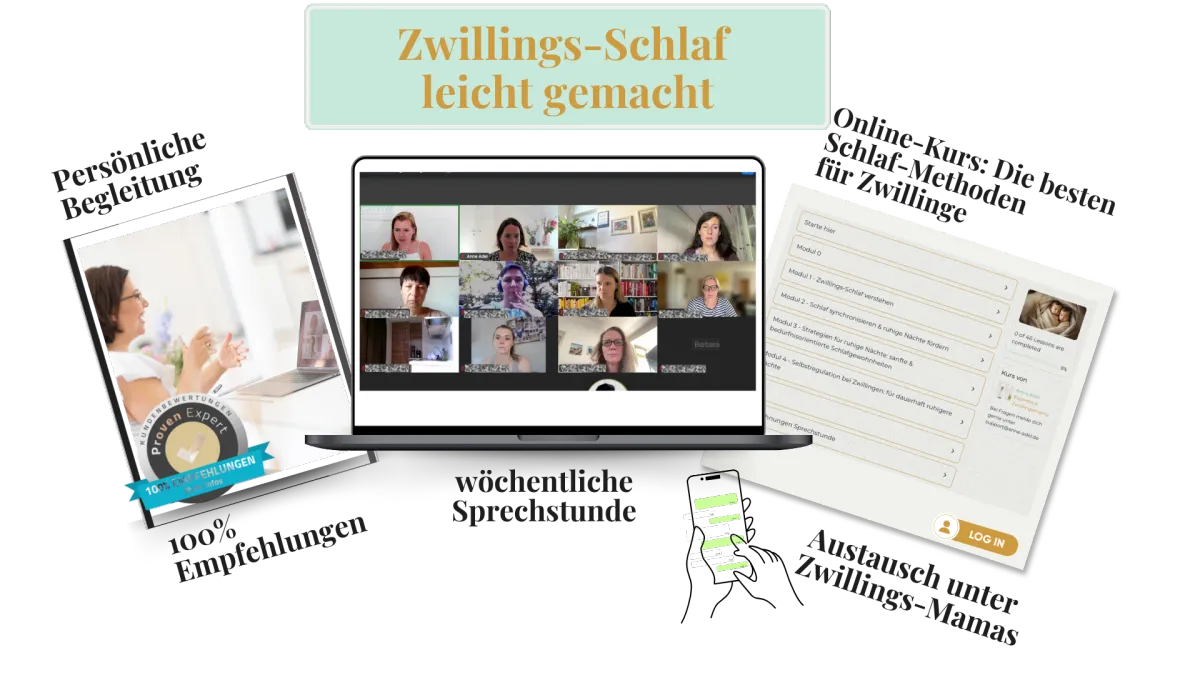 Du erfährst in diesem 8-wöchigen begleiteden Online-Kurs, wie du harmonische Schlafroutinen für deine Zwillinge entwickelst – ohne Frust und Stress, mit persönlicher Betreuung und in einer kleinen, unterstützenden Gruppe. Schritt für Schritt findest du die richtigen Schlafstrategien, die für Zwillinge wirklich funktionieren – ganz bequem von zu Hause aus.